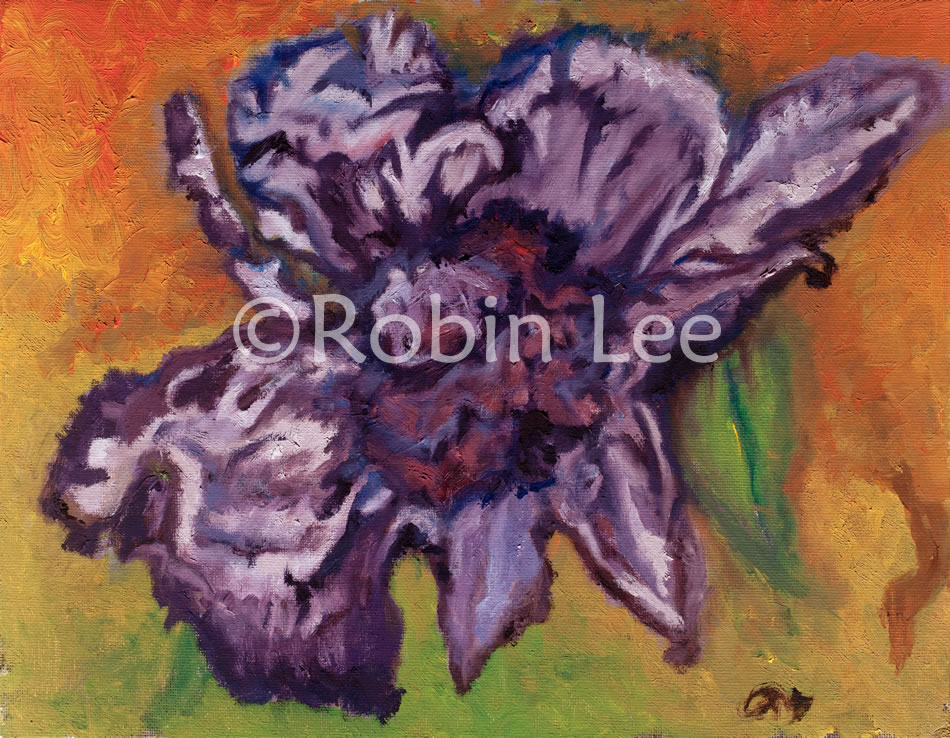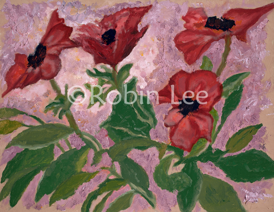 The simple power of the red image suggests an infusion of life, like a flattened fifth creates a harmonic dissonance. Mauve balanced against green sets of a series of changes that, like a blue note in jazz, creates a tension that pulls the listener into a resolution. Her image of the Red Poppy clearly demonstrates a neo-impressionist note that suffuses this work with a vision that transcends the simplicity of the subject. This painting is in Oil and was completed December 2011 it was inspired and referenced by and Oil painting of Anemones by Don Stern a study in color.
