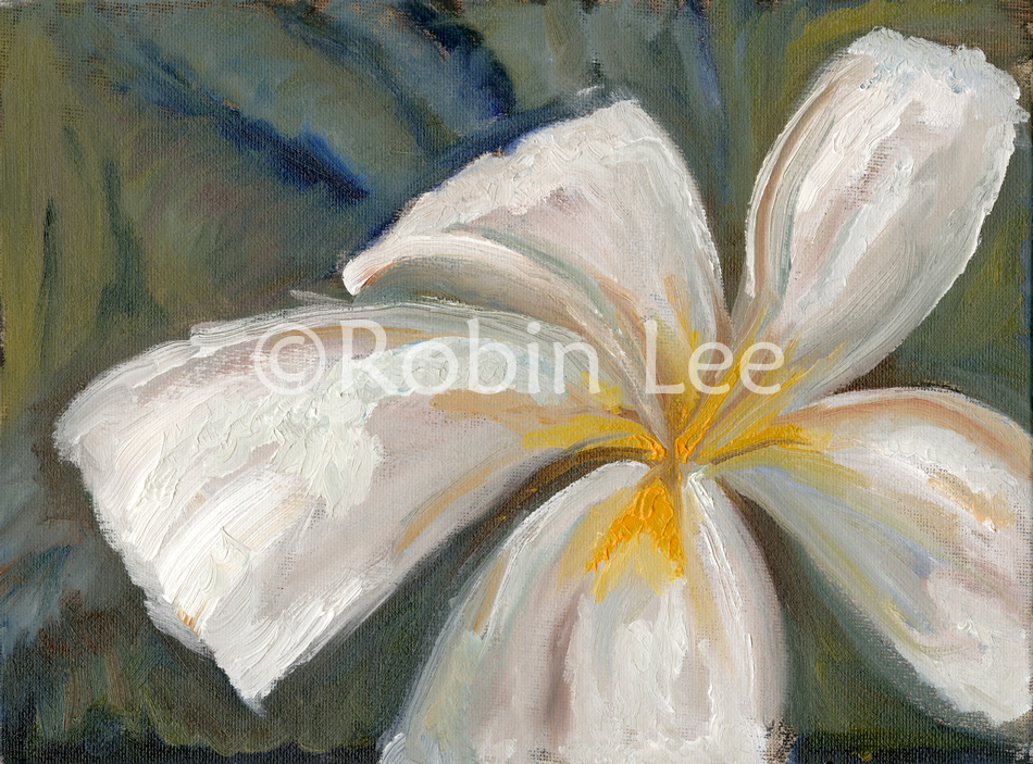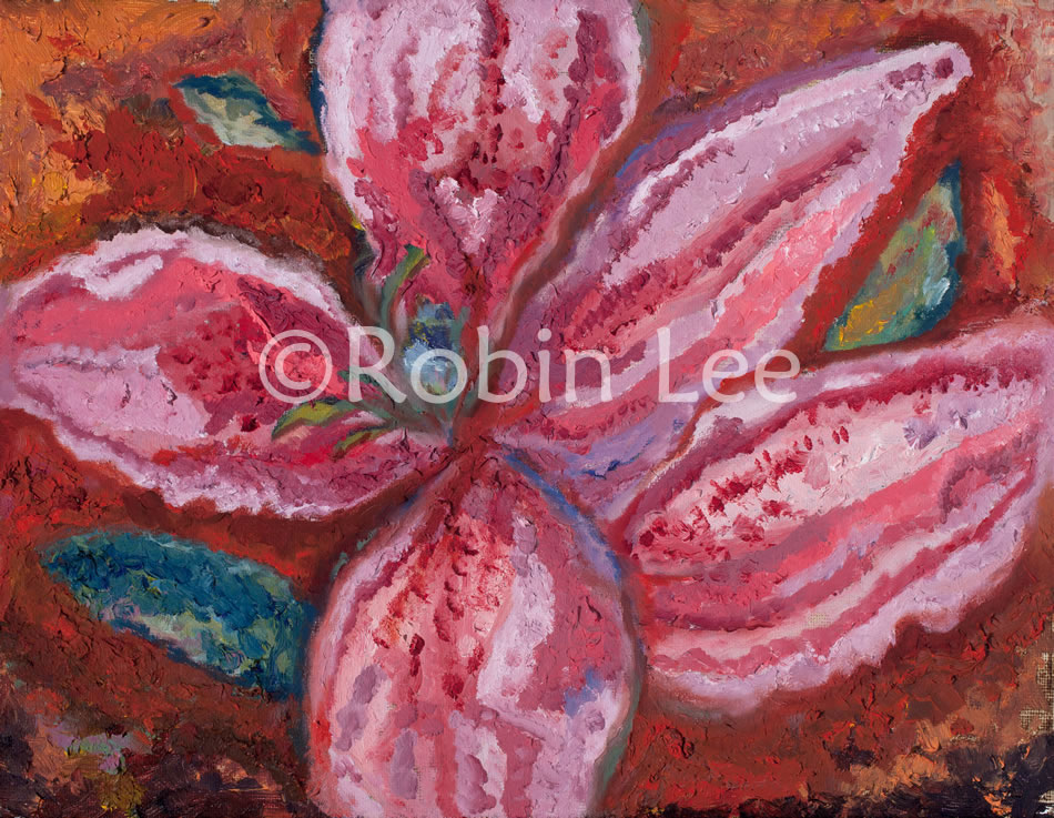 Robin’s vision of color harmony through the use of complementary colors. Cool colors juxtaposed with warm draw the mind’s eye into the memory of the experience of a bittersweet moment; the image becoming the metaphor for the memory. Again, texture and simplified form dominate in the style that allows the perception of the viewer to color from memory and complete the image.