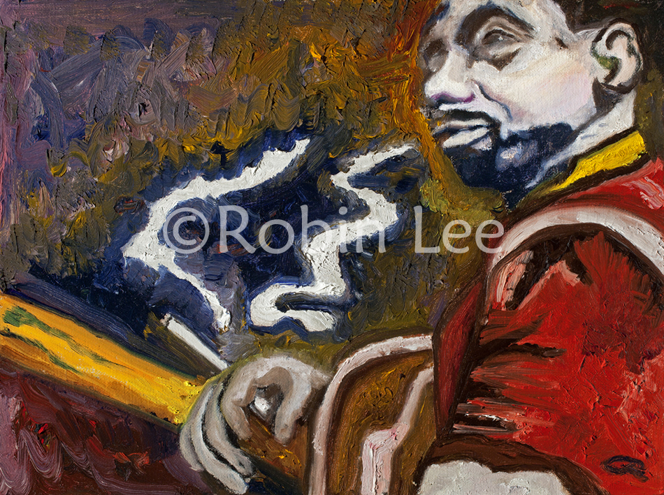 We have the essence Wes Montgomery is jazz. Robin Lee is jazz. She is able to paint what he plays. Her gift for improvisation, form and style perfectly coordinates the style and form of Wes Parker. A glorious melding of 60’s jazz and modern artistry. Robin Lee’s styling of Wes Montgomery is like a recording of his lyrical vibes and guitar riffs playing quietly and smoothly the way jazz is meant to be heard. Robin shows it to us. She paints like a musician. Wes plays like an artist. We are able to see it, hear it and feel it.